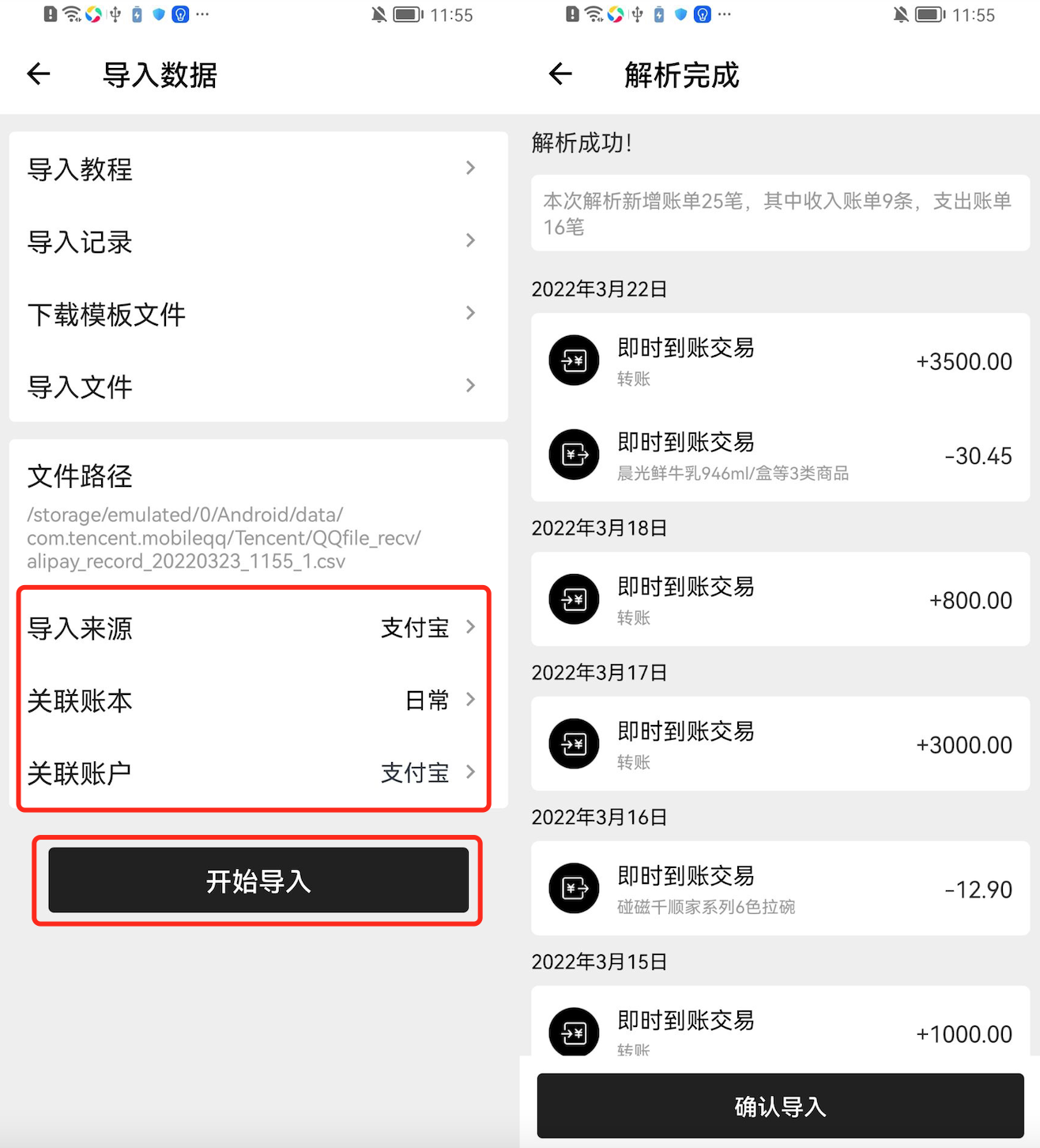 5.确认账单无误后,点击确认导入,系统将会根据原始账单生成的时间依次插入到极简记账的账单中,您可以返回到极简记账中查看。所有的账单将会在我的 -> 导入数据 -> 导入记录中生成一条记录,如果数据有误,您可以进行批量删除