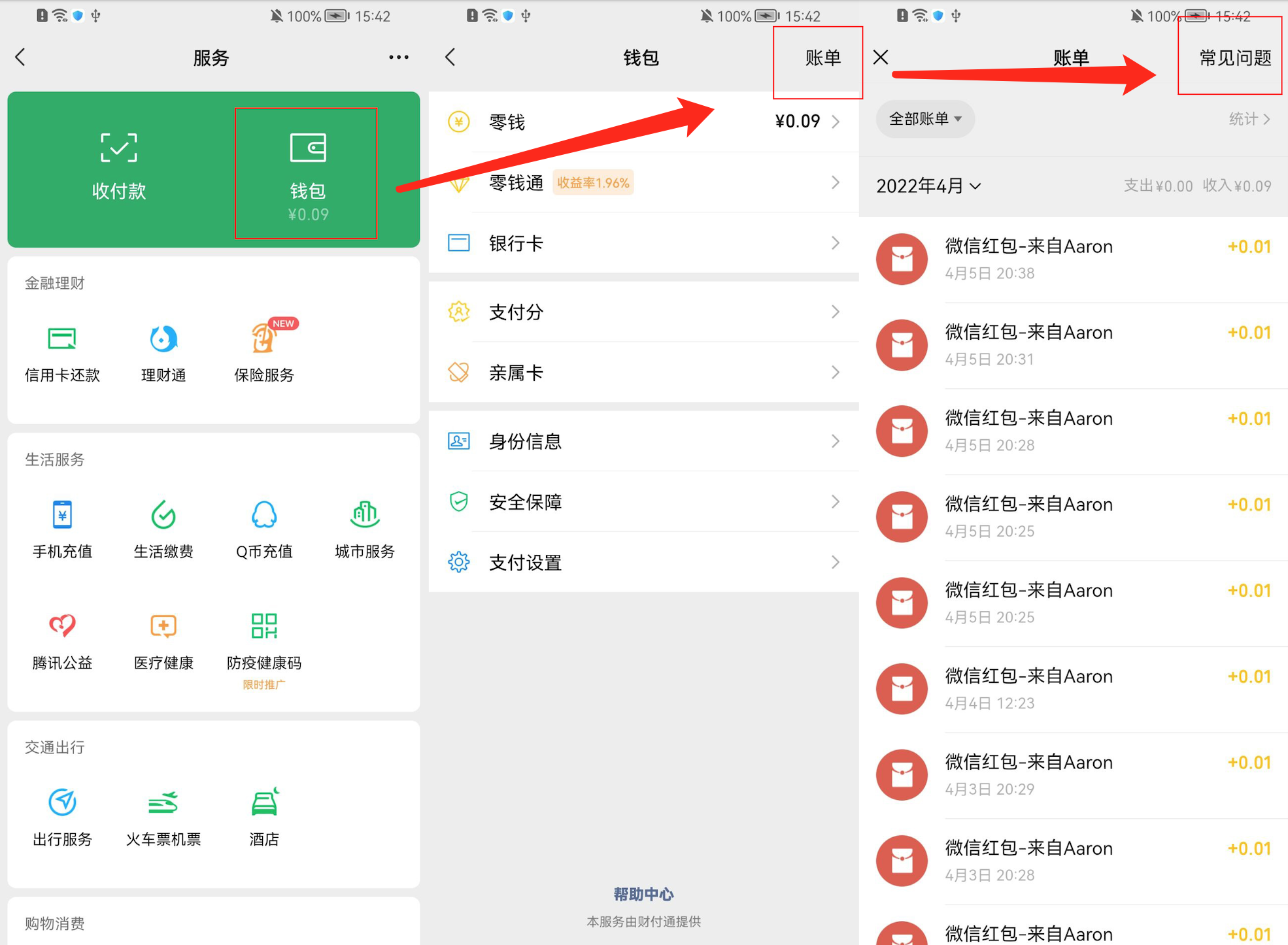 - 进入我 -> 服务 -> 钱包 -> 账单 -> 常见问题;
