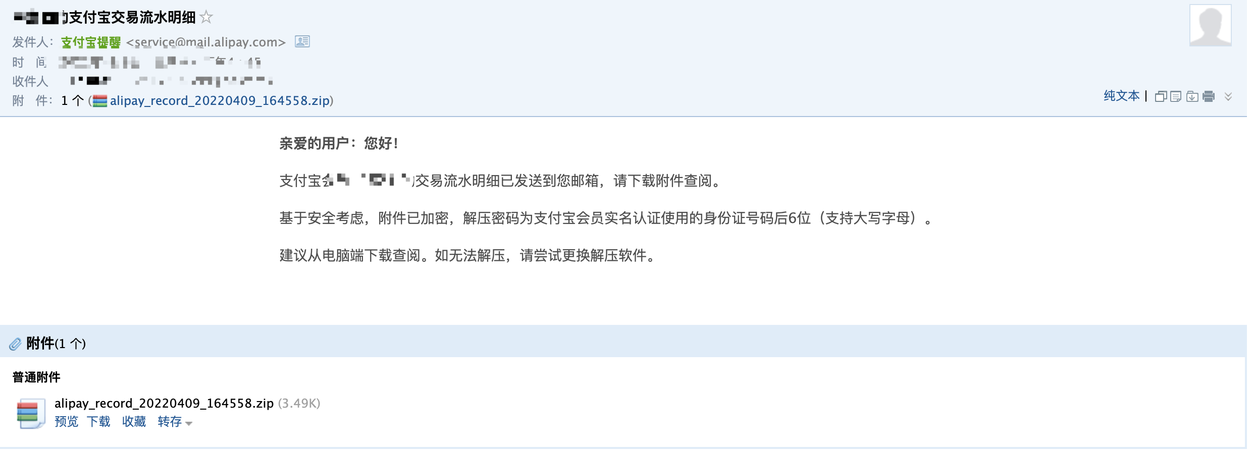 5.发送完成后您可以到收件邮箱查看邮件,下载支付宝账单文件,解压密码为您身份证的后6位。解压完成后可以通过微信/QQ等方式将解压的支付宝账单文件保存至手机处。