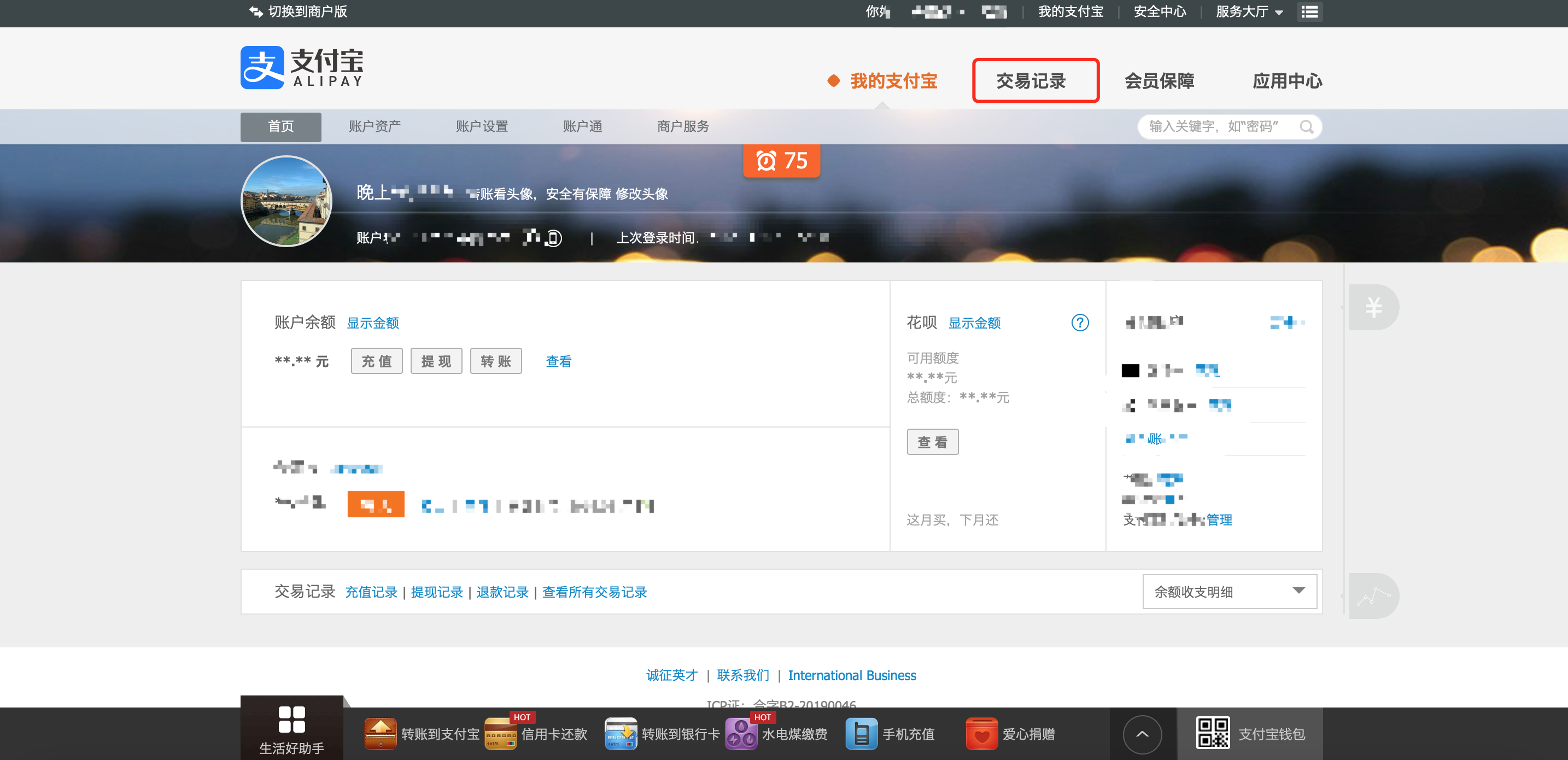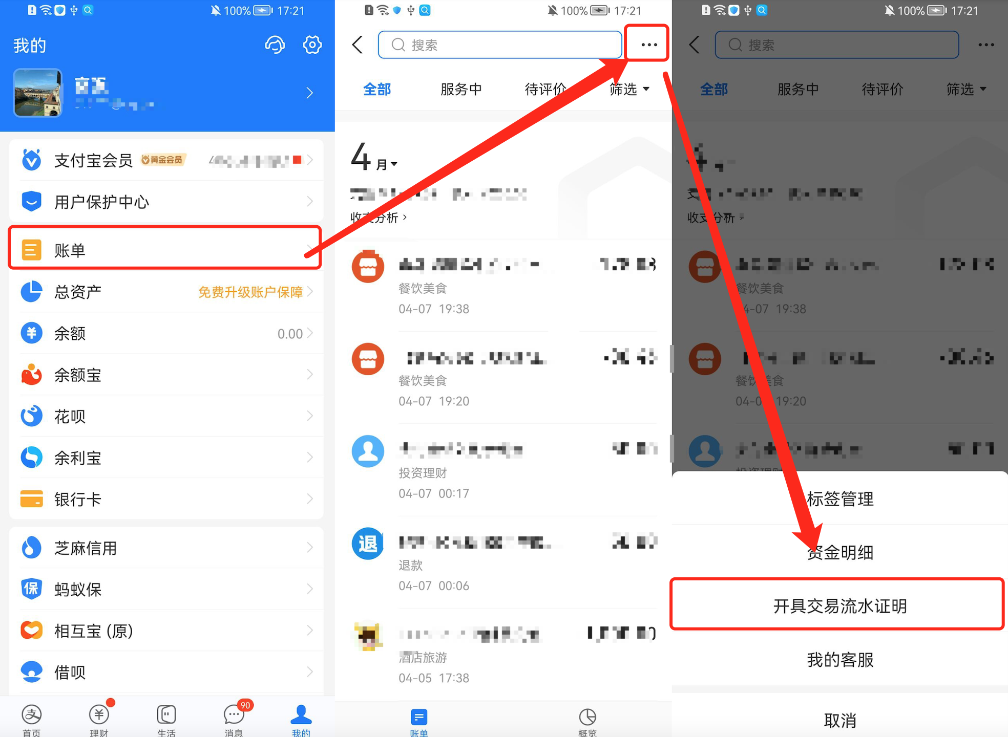 1.进入 我的 -> 账单 -> 点击右上角更多按钮... -> 开具交易流水证明;