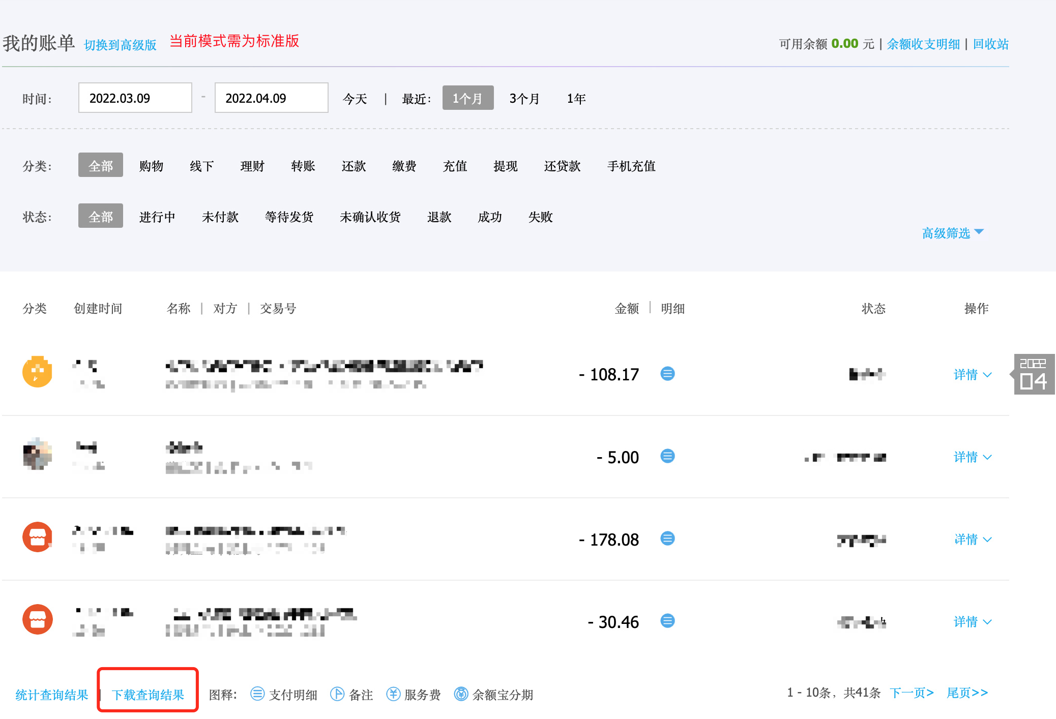 3.筛选你所需要的支付宝账单时间及分类,拖动网页到最下方,点击 下载查询结果 (需在标准版模式下)